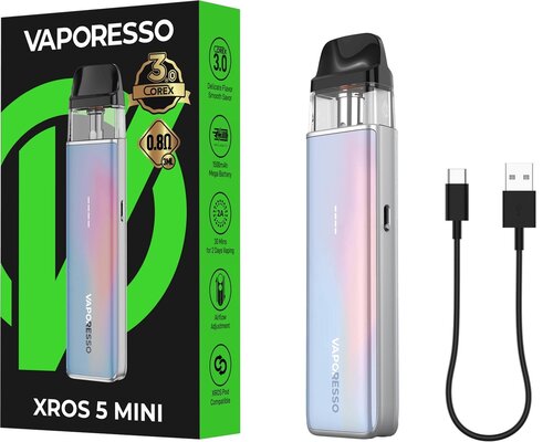 The Vaporesso XROS 5 Mini Pod System is a compact variant of the XROS 5, tailored for users who seek outstanding performance in a more portable format. This model also utilizes the COREX 3.0 technology to provide a richer aroma reproduction, delicate flavor, and a smoother vaping experience—all with a 1500mAh battery and adjustable airflow control. The primary difference is that the XROS 5 Mini omits the large 0.88-inch HD screen found on the standard XROS 5, making it even more streamlined and pocket-friendly. It still supports 3A fast charging, ensuring you can quickly power up and get back to enjoying your vape.
